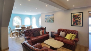 A kép, a tetőtéri lakosztály nappali szobáját ábrázolja.
