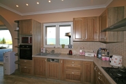 A földszinti konyha berendezési tárgyai: Ariston Hotpoint gáz főzőlap, Cata szagelszívó, Bosch sütő, mosogatógép. A mosogató gránitból készült. A képen, a földszinti konyha látható.