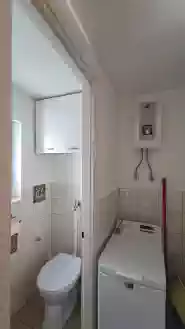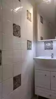 A képeken a fürdőszoba egy-egy részlete és a külön helyiségben kialakított illemhely és előtér látszik a mosógéppel.